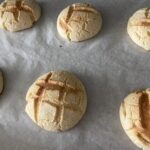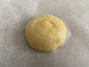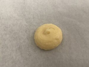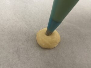 11.生地をしぼり袋に入れます。鉄板にオーブンシートを敷いて、その上に8個分ずつ絞っていきます。口金で真ん中を少しだけ押すようにしながらしぼるとまんまるになります。