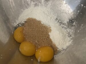 2.ボウルに卵黄、砂糖、小麦粉、コーンスターチを入れホイッパーで良く混ぜておきます。
