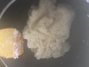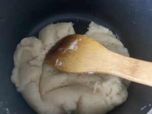 6.一旦固くなり、もったりしてきても混ぜ続けると、だんだんもったり感がなくなりツヤが出てくるので、そこで火を止めバットに移します。