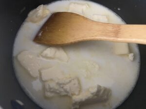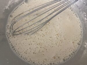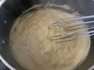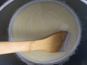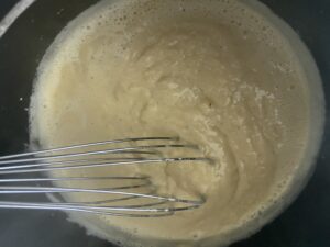 5.とにかく周りや底が焦げないようにホイッパーで混ぜ続けます。