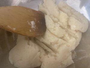 5.べたつかなくなってきて、小鍋に生地を押し付けてもはじくようになったら火を止め、大きめのボウルに移します(バターがにじみ出る寸前くらいでおしまい)