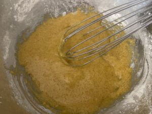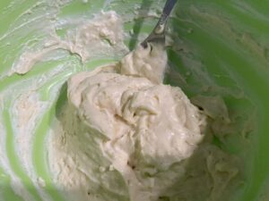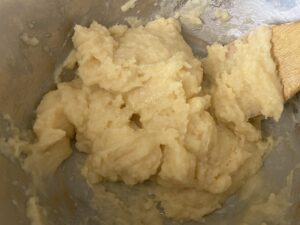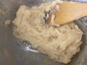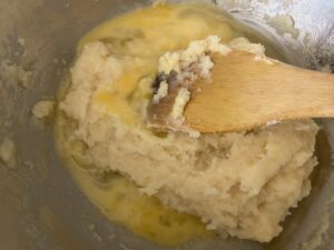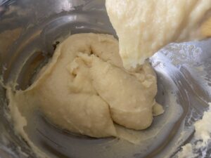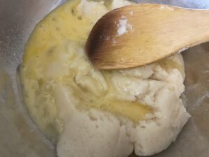 7.しっかり混ざったらまた卵1個分くらい入れてよく混ぜます。ねっとりしてきましたが、まだまだです。