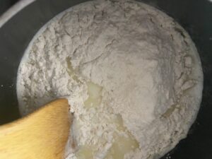 3.バターが完全に溶けて湧いてきたら小麦粉を一気にいれ、木べらで混ぜます。