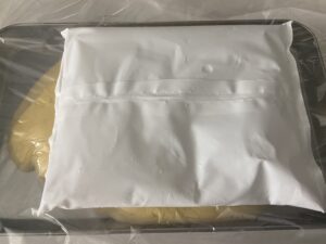 7.バットに移したらラップをしっかりカスタードに密着させ、その上に保冷剤を乗せて冷やします。
