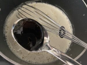 4.良く混ざったら、再び小鍋に入れ、このタイミングでバニラビーンズを入れ、中火にかけます。