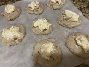 10.生地のへそを上にして丸く伸ばしたら、チーズクリームを生地の上に乗せていきます。