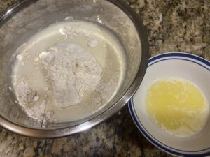 3.強力粉400g、砂糖40g、塩:8g、イースト3g、豆乳140g、水150gを入れたボウルに、溶かしバターを加えます。