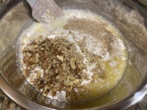 4.くるみとごまも加えたら、ゴムベラでよく混ぜます。