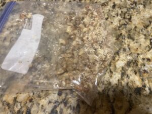 2.くるみ70gをジップロックなどの袋に入れ、綿棒で叩いて細かく砕きます。