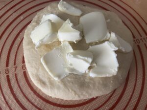 1.バター以外の材料を全てボウルに入れ、ゴムベラでしっかり混ぜた後、軽くまとまったら台に出して、擦り付けるようにしてこねる(約10分)。