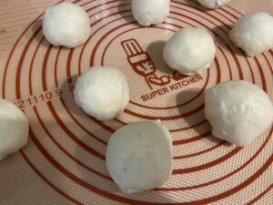 3.室温に戻したパン生地を10等分に分け、綺麗に丸める。濡れ布巾をかけて10分ほど休ませる。