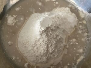 1.ぬるま湯にドライイーストを入れ、よく混ぜ合わせます。