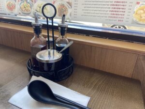 テーブルにはお酢、お醤油、ラー油が置かれていました。ちなみにお醤油はキッコーマンでしたよ!