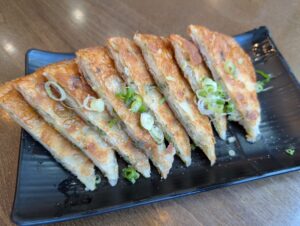 ネギがたっぷり入ったチヂミでした!おそらく具材はネギだけで、サクサクもちもちに揚げられた、生地を楽しむお料理なのかと思います。