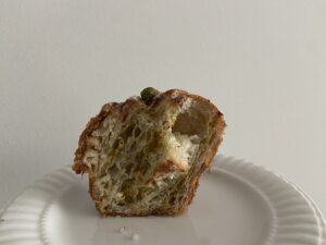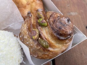 モーニングバンのクロワッサン生地に、ピスタチオクリームが練りこまれており、上にはシュガーグレーズと、ピスタチオが乗っています。