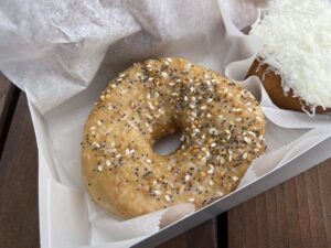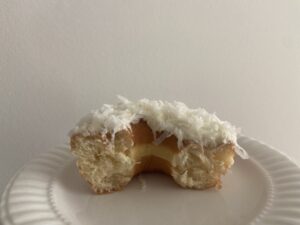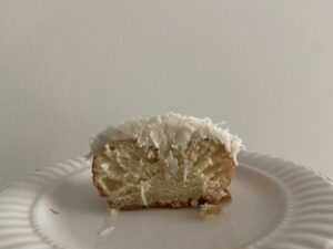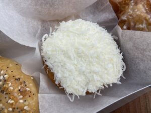 まあるいケーキ生地の上に、クリームチーズとココナッツがたっぷり!ちなみに、穴の開いていないタイプのドーナツです。