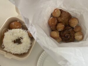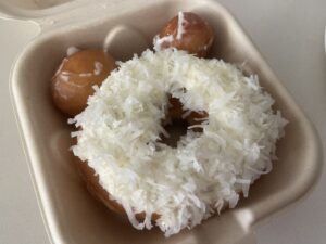 甘いドーナツと、少し塩味のあるチーズ、そしてココナッツ。美味しくないわけがありません。