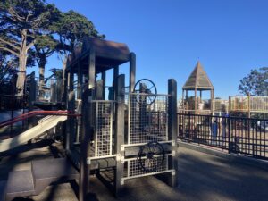 アラモスクエアは芝生の公園で、のんびりした雰囲気が漂っているのですが、一角には、子供向けの遊具もありました。
